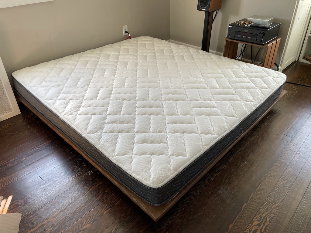 This could be a post all its own, but the world is imperfect and I will include some musings here: Mattresses these days are too thick. I recently bought a premium mattress (not pictured) from Gold Bond in Hartford, CT. It was over 13″ thick. It is remarkably comfy, but it looks like trash to my eye. I should have thought more deeply, considered more strongly, and otherwise refused to settle, but alas, I spent my money regrettably. The finished surface of my new bed is only about 13″ above the ground and I think that is quite proper, maybe even a bit high. So what can I do with a 13″ mattress? Nothing. You basically have to put it directly on the floor and then you have no toe kick. Not a good position to be in.