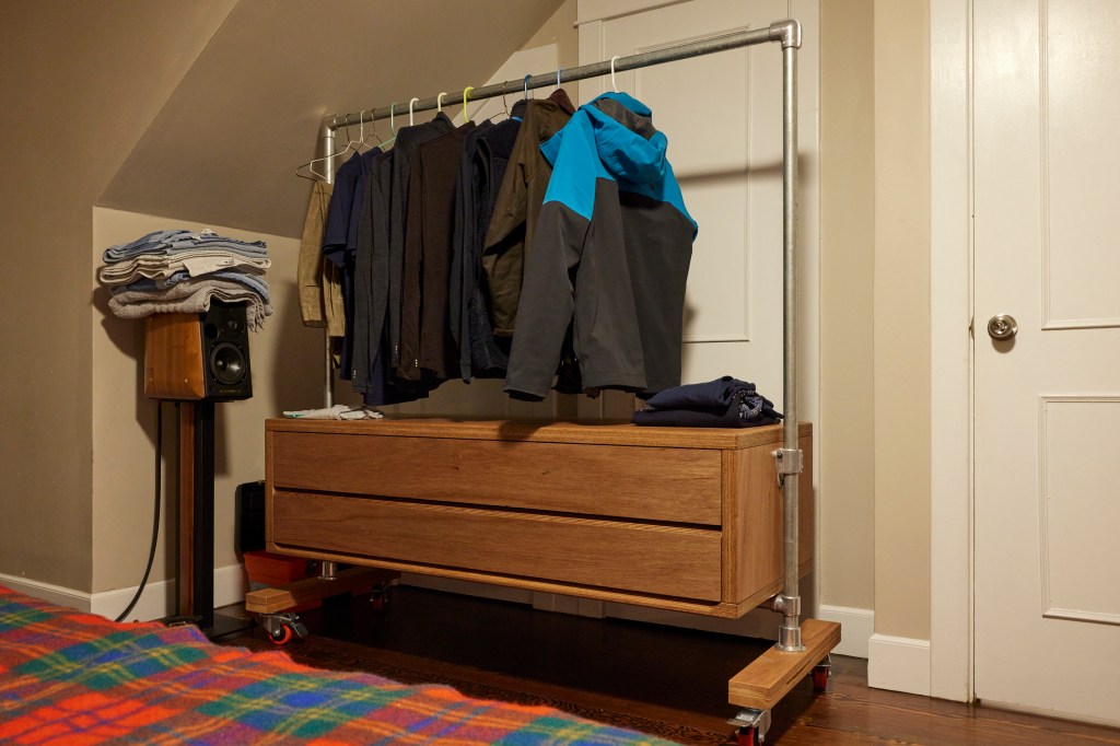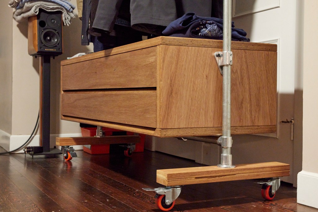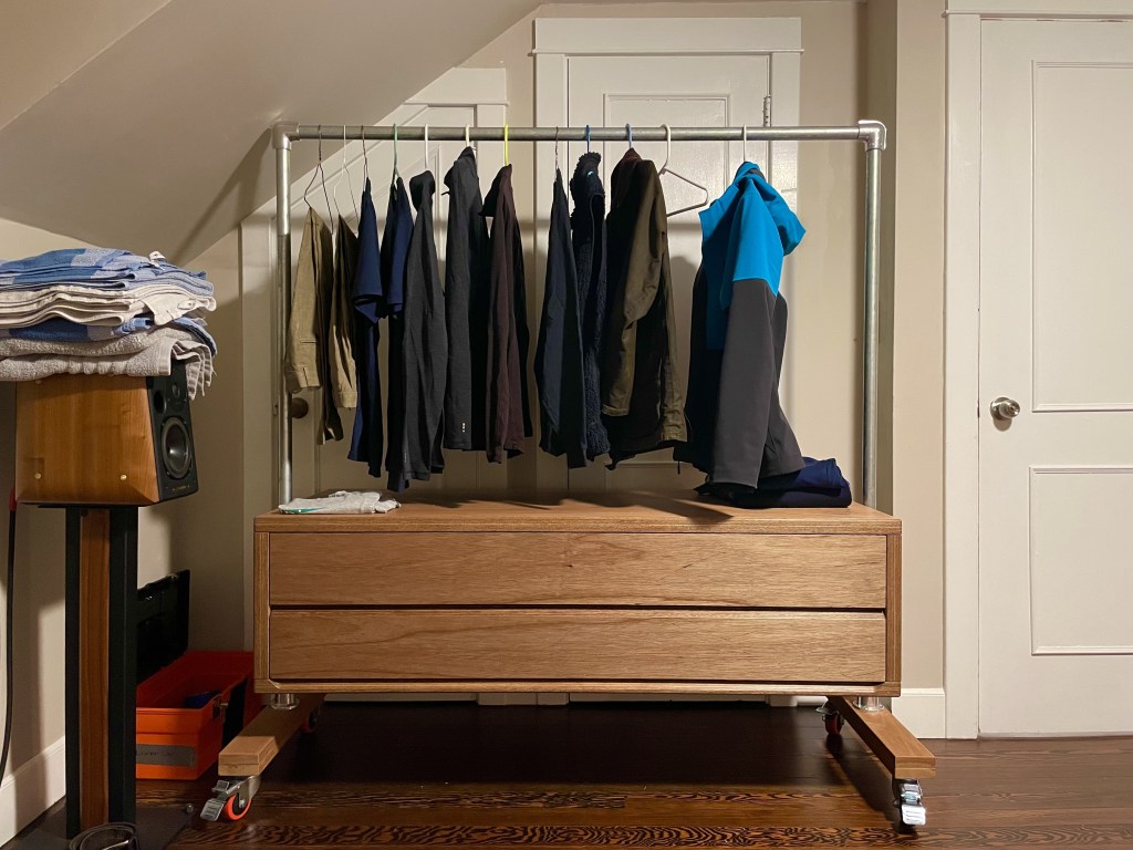 I’ve long been fascinated with rolling clothes racks. Also Speed Rail. A few years back, an esteemed friend trusted me to design and execute a clothes hanging solution out of pipe and speed rail. It is a large, robust, and glorious thesis. (Not pictured)