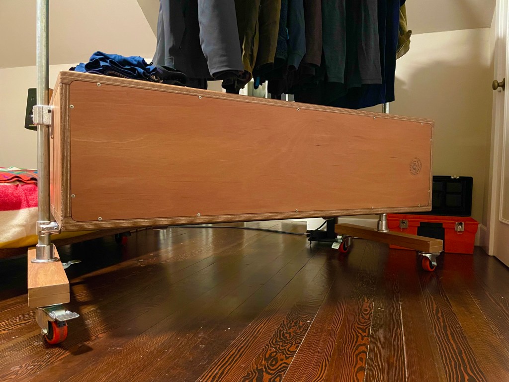 What a presence the thing has. You can see that the hanging items of clothing do not hit the cabinet. The cabinet was an afterthought, but a very good one. I noticed that given my lack of long dresses and long outerwear, I had quite a bit of unutilized space below my hanging items and above the bottom pole that seemed to be begging for a cabinet, or perhaps a platform to place shoes on, so I made the former, but could more easily have made the latter. Two roads diverged and what not.